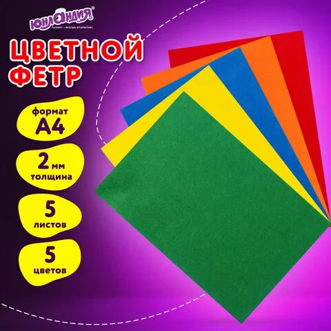 Цветной фетр для творчества А4 ЮНЛАНДИЯ 5 ЯРКИХ ЦВЕТОВ, толщина 2 мм, с европодвесом, 662049