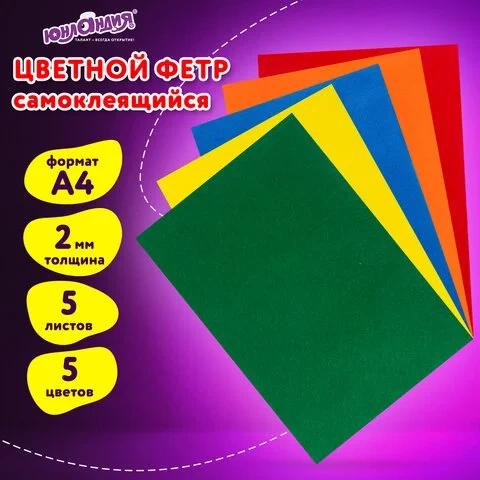 Плотность - 170 г/м2 и толщина в 2 мм гарантируют поделкам отличное качество и долгий срок службы. Цветной фетр формата А4 поставляется в упаковке по 5 листов, 5 насыщенных цветов. Такое многообразие оттенков придется по вкусу любому покупателю. Фетр обладает приятной нежной фактурой, прост и удобен в использовании. Края не осыпаются при разрезании, благодаря чему не нуждаются в дополнительной обработке, а самоклеящаяся основа позволяет надежно приклеить фетр без использования клея!