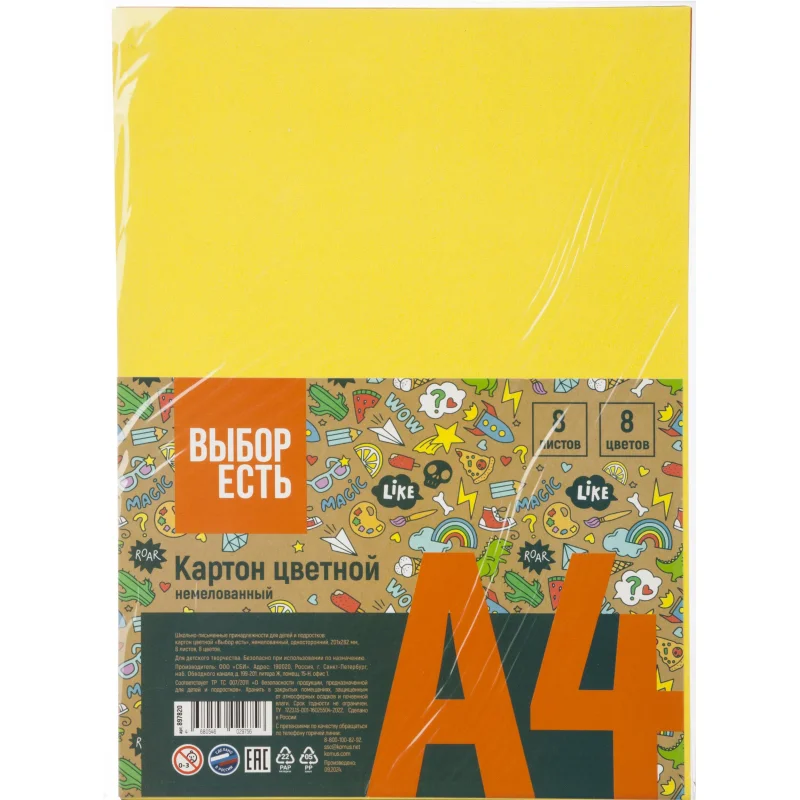Количество листов- 8, количество цветов- 8. Предназначен для рисования, аппликаций идругих видов творчества. Цвета внаборе: белый, желтый, зеленый, коричневый, красный, оранжевый, синий, черный. Внаборе листы размером 201x282мм. Упаковка- полиэтилен. Взависимости отпартии плотность картона может отличаться от190 до220 г/кв.м. В рамках ребрендинга производится перевод данного артикула с ТМ 1School на ТМ Выбор есть с сохранением всех потребительских характеристик товара. На переходный период допускается поставка данной продукции в двух вариантах дизайна.