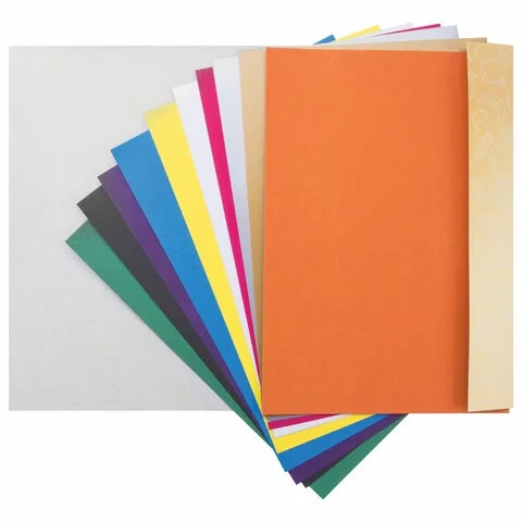 Немелованный картон с улучшенной прокраской обладает плотностью 200 г/м2. Легко режется ножницами, сгибается и клеится. Внутренний блок состоит из 10 листов формата А4 (200х290 мм) и 10 цветов: 8 основных + золото и серебро.