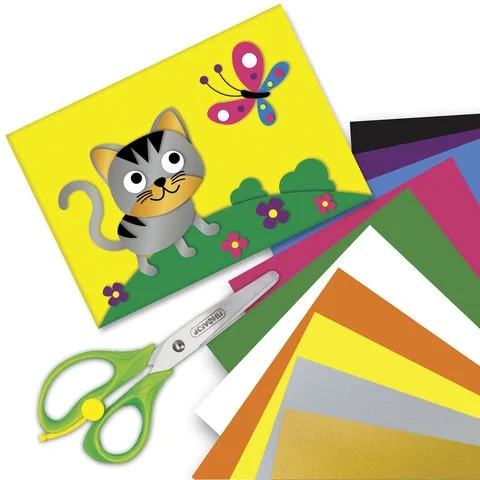 Немелованный картон с улучшенной прокраской обладает плотностью 200 г/м2. Легко режется ножницами, сгибается и клеится. Внутренний блок состоит из 10 листов формата А4 (200х290 мм) и 10 цветов: 8 основных + золото и серебро.