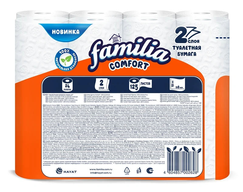 Мягкая туалетная бумага Familia Comfort (Фамилия Комфорт) подходит для всей семьи. Двухслойная структура бумажного полотна обладает отличными впитывающими свойствами, являясь при этом достаточно прочной. Туалетная бумага не вызывает раздражений и аллергических реакций, поскольку изготавливается из 100% первичной целлюлозы.