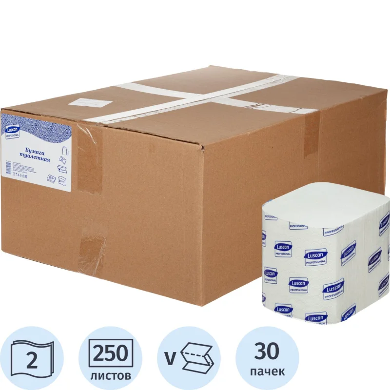 Бумага туалетная для диспенсера Luscan Professional 2-слойная белая первичная целлюлоза 250 листов, 30 пачек в упаковке. Размер листа в сложенном виде — 110?110 мм, в развернутом виде — 220?110 мм.