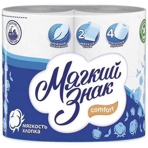 Туалетная бумага Мягкий Знак Comfort без аромата, белая, 2 слоя, 4 рулона, 144 листа, 18м