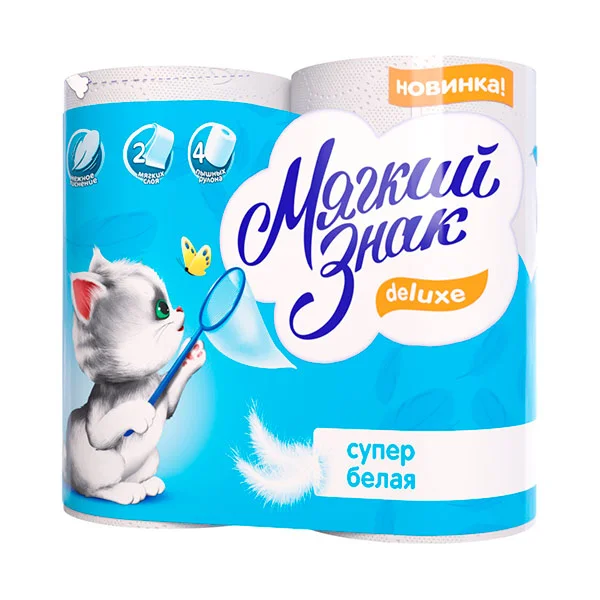 Бумага туалетная двухслойная «Мягкий знак Deluxе» изготовлена с применением технологии склеивания слоев по рисунку. Бумага не ароматизирована, с тиснением.