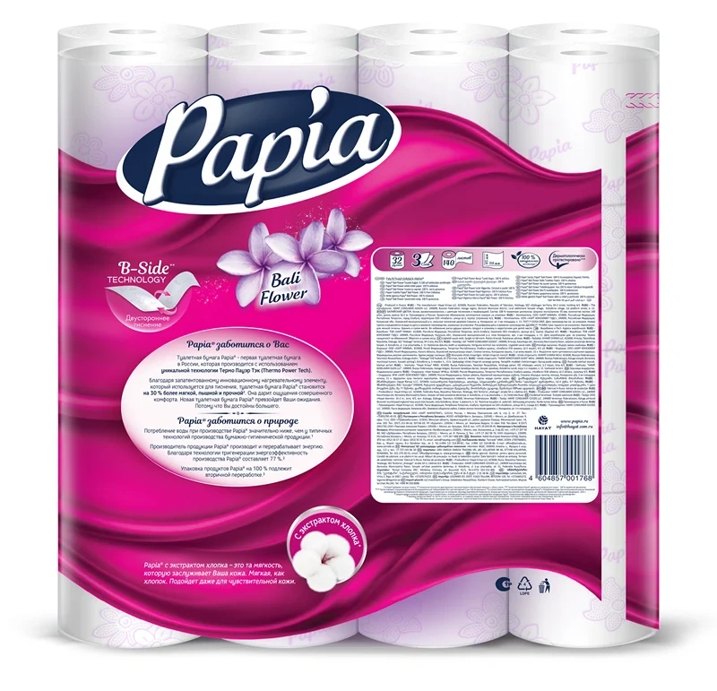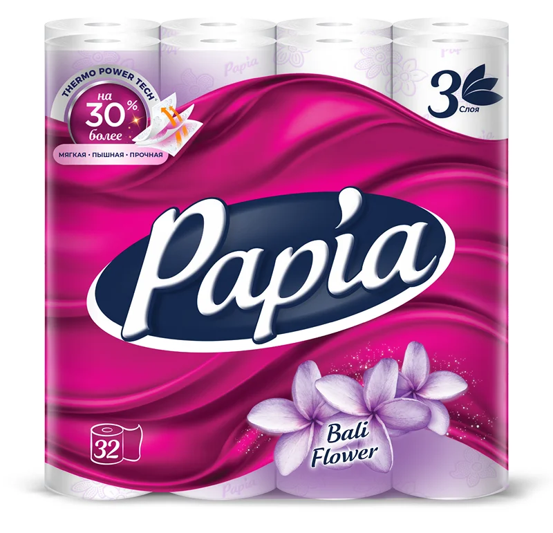 Ароматизированная трехслойная туалетная бумага Papia 'Балийский цветок' с цветным тиснением и перфорацией. 'Балийский цветок' – нежный цветочный аромат подарит Вам наслаждение. Уникальная технология двустороннего тиснения бумаги обеспечивает лучшую впитываемость и мягкость с обеих сторон. Теперь содержит экстракт хлопка. Обновленная Papia - выбор тех, кто всегда стремится к большему. Благодаря новой, инновационной технологии Termo Power Tech теперь еще более мягкая, пышная и прочная.