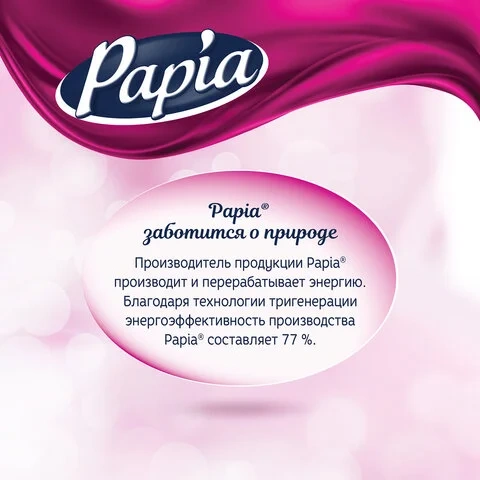 Бумага туалетная Papia 3-слойная белая 16.7 метров (4 рулона в упаковке). Белая трехслойная бумага Papia с экстрактом хлопка необыкновенно мягкая и в то же время прочная. Уникальная технология двустороннего тиснения бумаги обеспечивает лучшую впитываемость и мягкость с обеих сторон. Изготовлена из 100% натуральной целлюлозы. С тиснением и перфорацией.