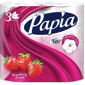 Знаменитая 3х-слойная туалетная бумага Papia с ароматом Клубники. Бумага имеет двойное тиснение, что придает ей беспрецедентную мягкость. В составе только 100% целлюлоза, что придает белоснежный цвет.