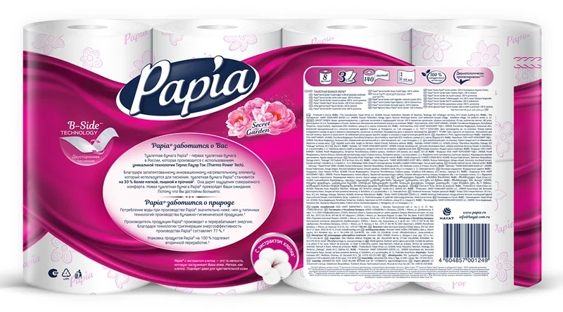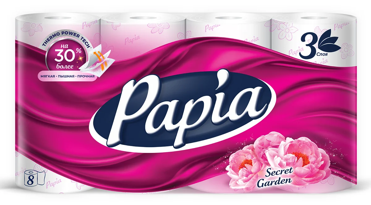 Ароматизированная трехслойная туалетная бумага Papia 'Secret Garden' с цветным тиснением и перфорацией. 'Таинственный сад' – свежий и яркий цветочный аромат поднимет Вам настроение. Уникальная технология двустороннего тиснения бумаги обеспечивает лучшую впитываемость и мягкость с обеих сторон. Теперь содержит экстракт хлопка. Обновленная Papia - выбор тех, кто всегда стремится к большему. Благодаря новой, инновационной технологии Termo Power Tech теперь еще более мягкая, пышная и прочная.