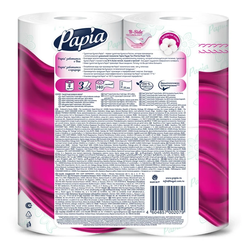Ароматизированная трехслойная туалетная бумага Papia 'Тропикал Экзотикс' с цветным тиснением и перфорацией. 'Тропикал Экзотикс' – нежный цветочный аромат подарит Вам наслаждение. Уникальная технология двустороннего тиснения бумаги обеспечивает лучшую впитываемость и мягкость с обеих сторон. Теперь содержит экстракт хлопка. Обновленная Papia - выбор тех, кто всегда стремится к большему. Благодаря новой, инновационной технологии Termo Power Tech туалетная бумага теперь еще более мягкая, пышная и прочная.