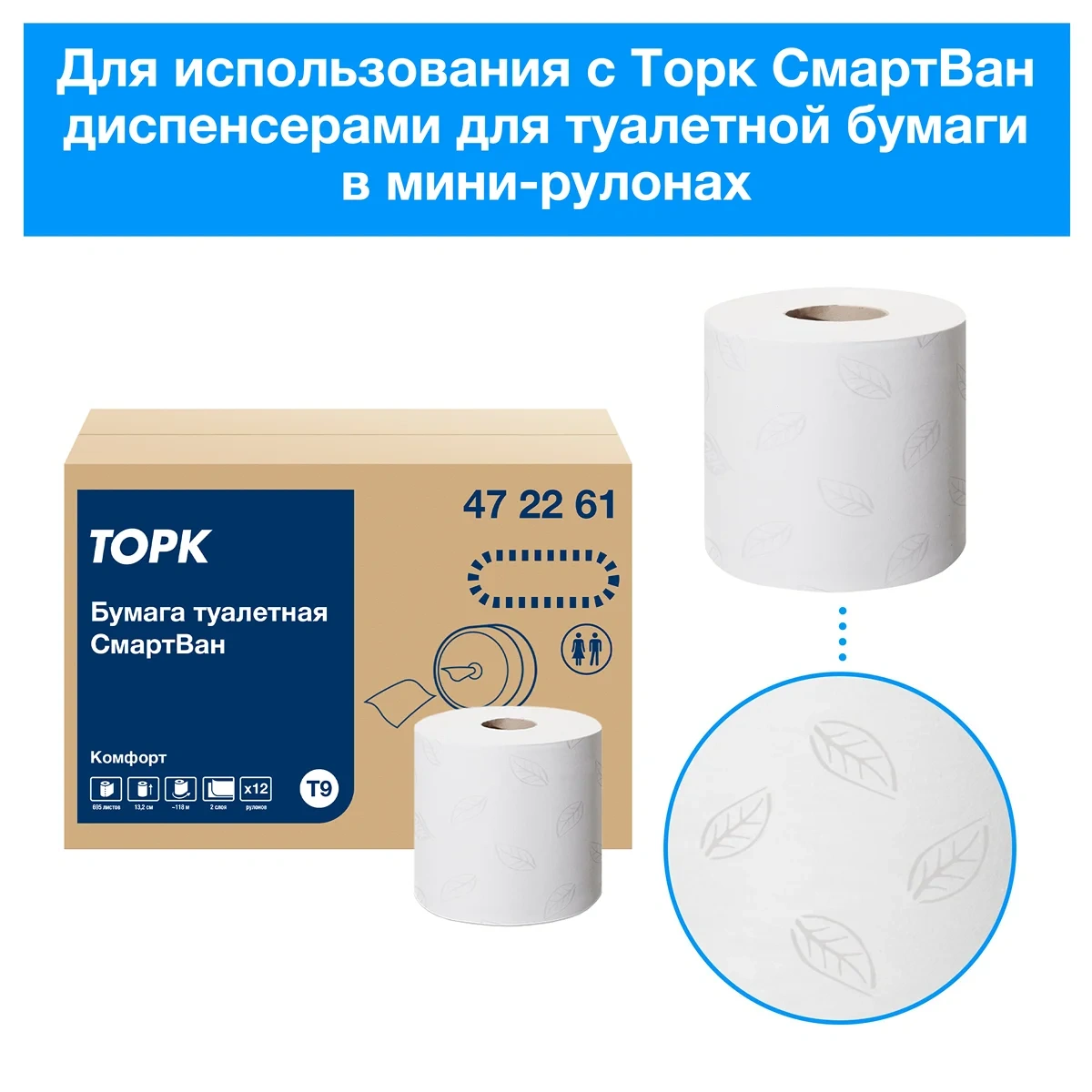 Торк СмартВан высокой емкости подходят для туалетных комнат с низкой и средней проходимостью, к которым предъявляются высокие требования.Tork SmartOne® — уникальная система, обеспечивающая гигиеничный полистовой отбор и до 40% экономии по сравнению с традиционными большими рулонами. Мини-рулоны - Произведено из переработанного сырья - Легкий отбор из диспенсера позволяет позволяет комфортно пользоваться туалетной комнатой - Увеличенное количество листов позволяет реже обслуживать диспесеры - В коробе 12 рулонов
