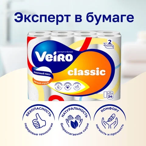 Туалетная бумага Veiro Classic без аромата, белая, 2 слоя, 24 рулона, 140 листов, 17.5м