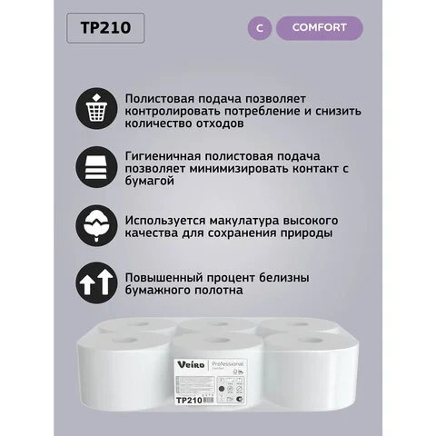 Туалетная бумага Veiro Professional Comfort ТР210, центраяльная вытяжка, 215м, 2 слоя, белая, 1 рулон