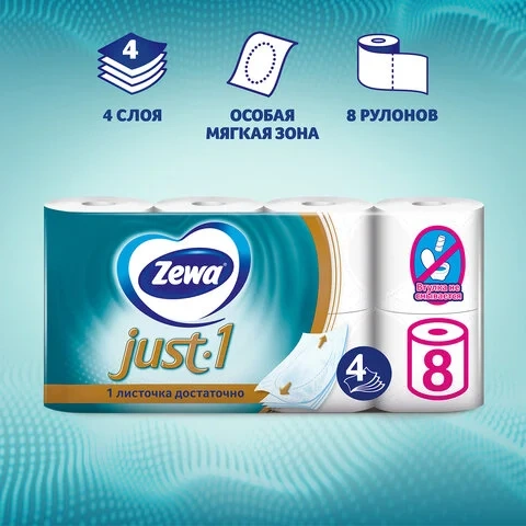 Туалетная бумага Zewa Just 1 4-слойная, 8 рулонов