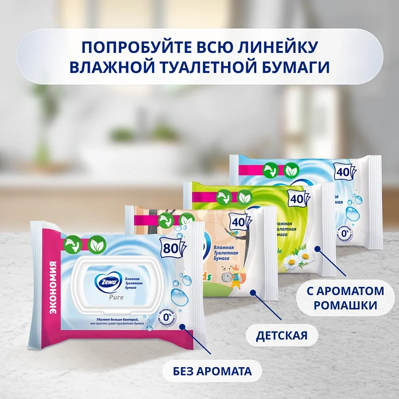 Туалетная бумага Zewa Pure влажная, 4 x 80шт