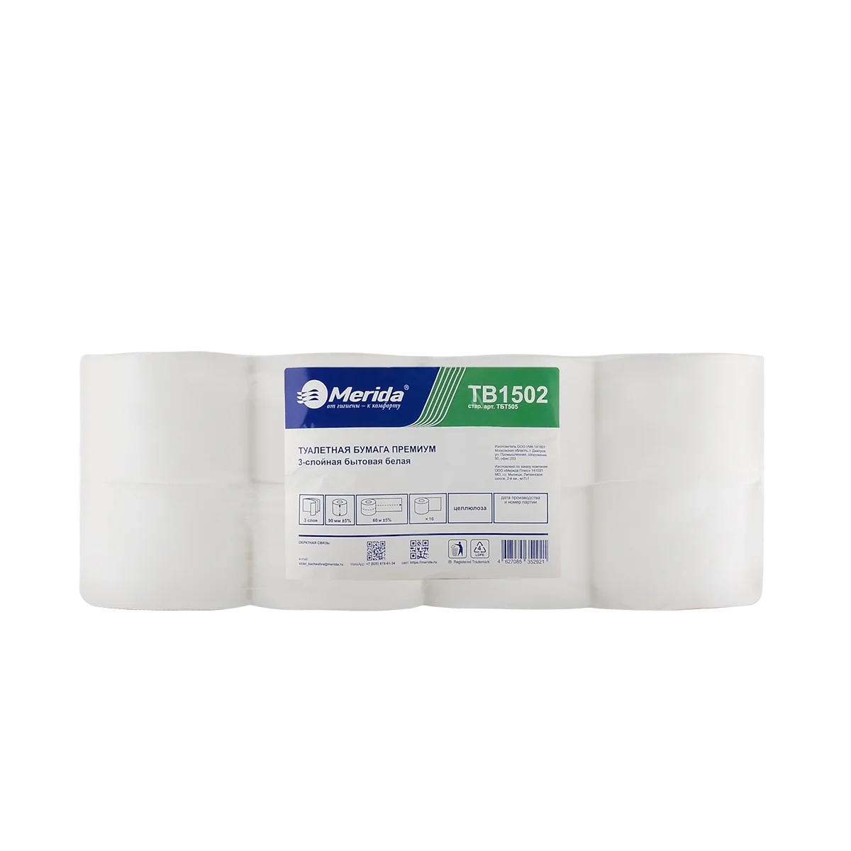 Туалетная бумага Merida TB1502 в рулоне, Премиум, 3 слоя, 60м, белая, 16шт/уп