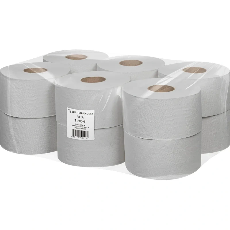 Туалетная бумага серая, 1 слой, 200м, 12 рулонов