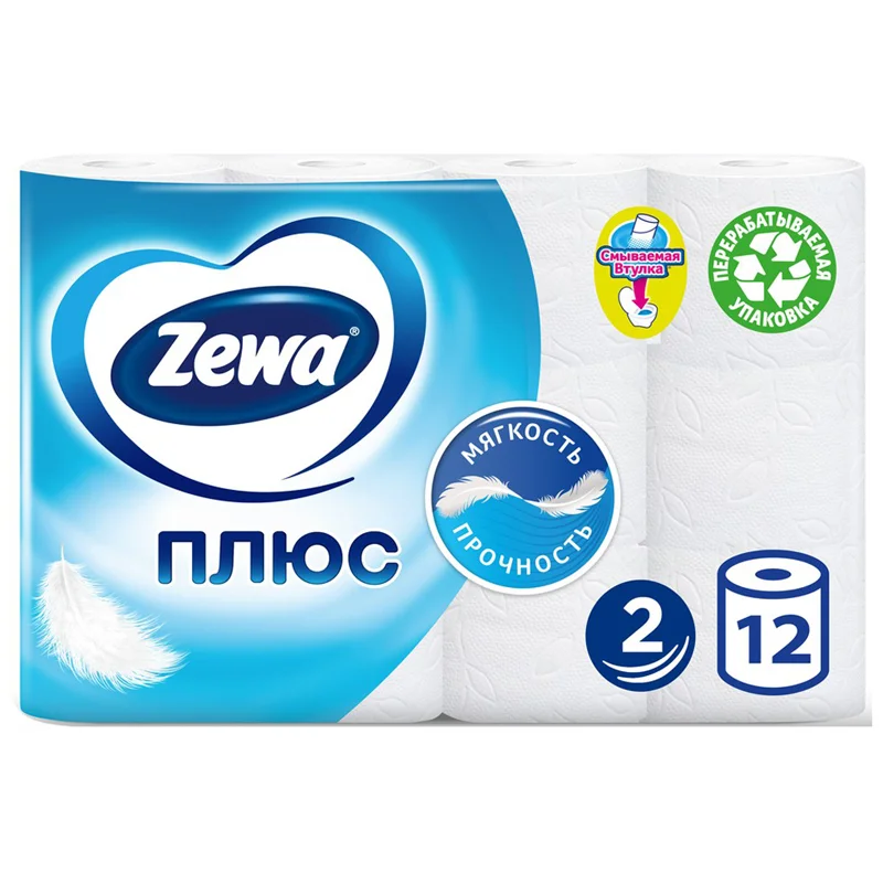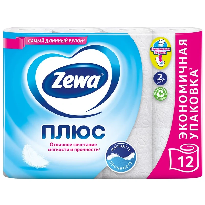 Туалетная бумага Zewa Плюс без аромата, белая, 2 слоя, 12 рулонов, 184 листа, 23м