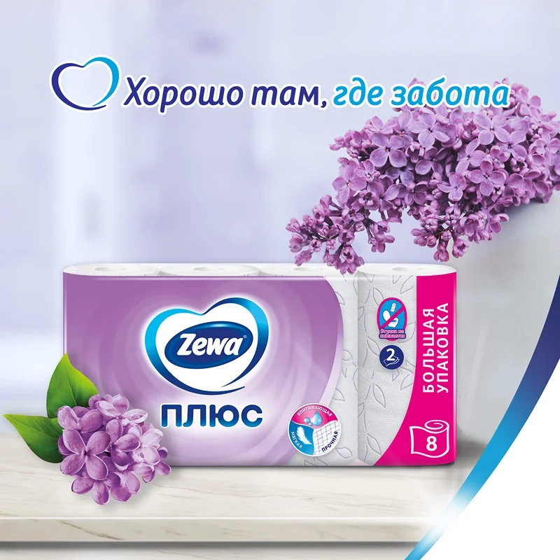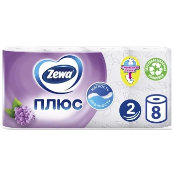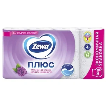 Туалетная бумага Zewa Плюс сирень, белая, 2 слоя, 8 рулонов, 184 листа, 23м