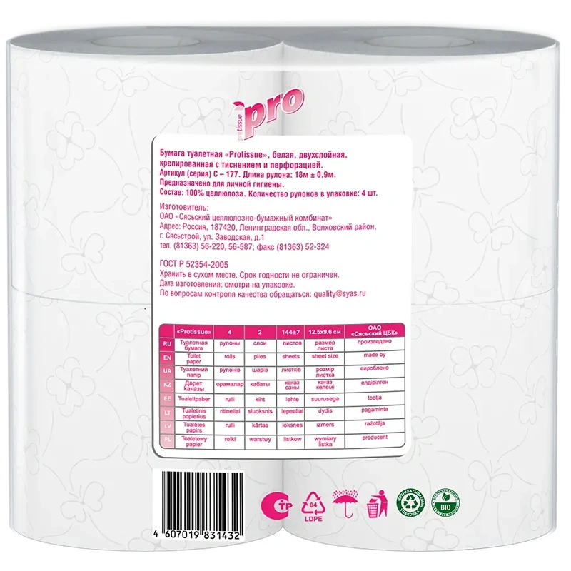 Туалетная бумага Protissue С177 в рулоне, 2 слоя, 18м, белая, 4 рулона