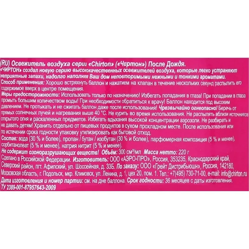 Состав:> 30 % солей неорганических, анионных ПАВ; 5-15 % неионогенных ПАВ; < 5 % красителя, комплексообразователя, растворителя, отдушки (в т.ч. лимонена).