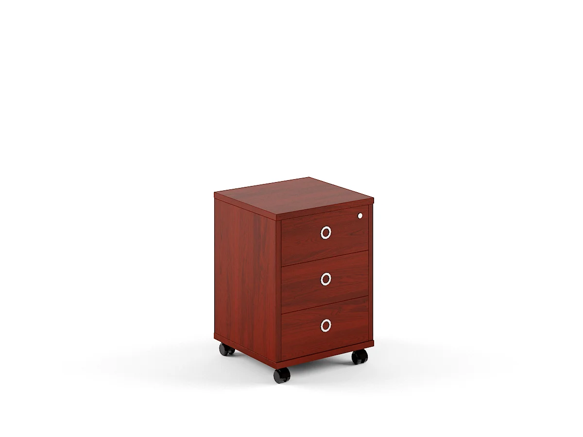 Универсальная мобильная тумба BORN для офисного или домашнего использования. Размеры - 480х660х455 мм, цвет - Бургунди. Количество ящиков - 3. Ящики тумбы оснащены центральным замком и декорированы стильными круглыми металлическими ручками. Конструкция тумбы оснащена прочными силовыми креплениями – эксцентриковыми стяжками. Все торцы основных элементов тумбы надежно защищены кромкой ПВХ – 2 мм. Удобные колесики с плавным ходом.