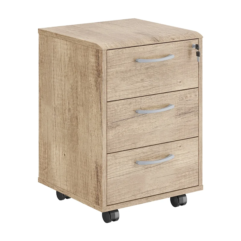 Универсальная мобильная тумба DIONI для офисного или домашнего использования. Размеры - 465х664х450 мм, цвет - Дуб Каньон. Количество ящиков - 3. Ящики тумбы оснащены центральным замком и декорированы стильными металлическими ручками. Конструкция тумбы оснащена прочными силовыми креплениями – эксцентриковыми стяжками. Надежная защита всех элементов из ЛДСП – кромка ПВХ. Удобные колесики с плавным ходом.