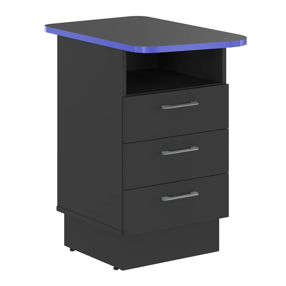 Универсальная приставная тумба для геймерских столов STG 1385 и STG 1390 в верхнем положении по высоте столешницы. Отличная система хранения - компактная и вместительная одновременно. Оптимальная эргономика: 3 ящика – чтобы все поместилось, и открытая ниша – чтобы самое нужное всегда было под рукой. Надежная защита торцевых поверхностей - кромка ПВХ 2 мм. Регулируемые опоры - для компенсации неровностей пола. Но главное, все же - это комфорт. SKLC-3D.3 - это про то, когда всё на своем месте.