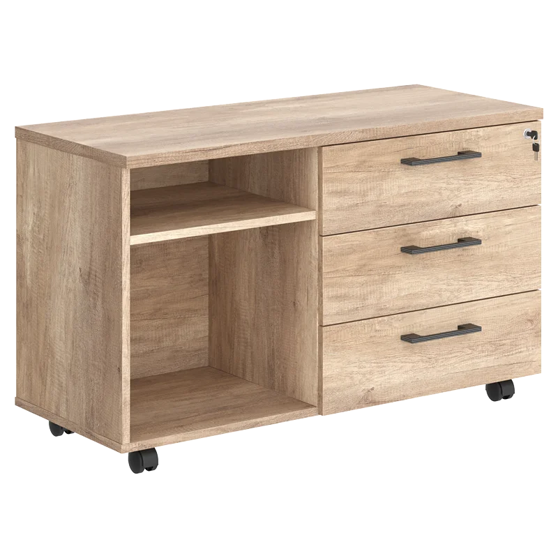 Солидная и большая приставная тумба TORR-Z для использования при оформлении современного кабинета в офисе или дома. Размеры - 1078х650х452 мм, цвет - Дуб Девон. Тумба имеет солидный верхний топ 25 мм. Удобные колесики с плавным ходом, надежная защита торцевых поверхностей - кромка ПВХ 2 мм. Тумба имеет эффектный и современный дизайн, одна ее половина выполнена в виде ящиков, вторая – открытые полочки. Количество ящиков – 3, количество полочек - 2. Ящики тумбы оснащены центральным замком. Конструкция тумбы оснащена прочными силовыми креплениями – эксцентриковыми стяжками.