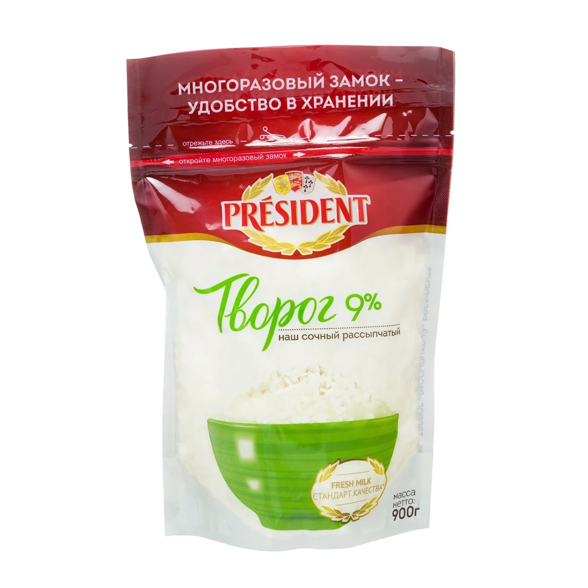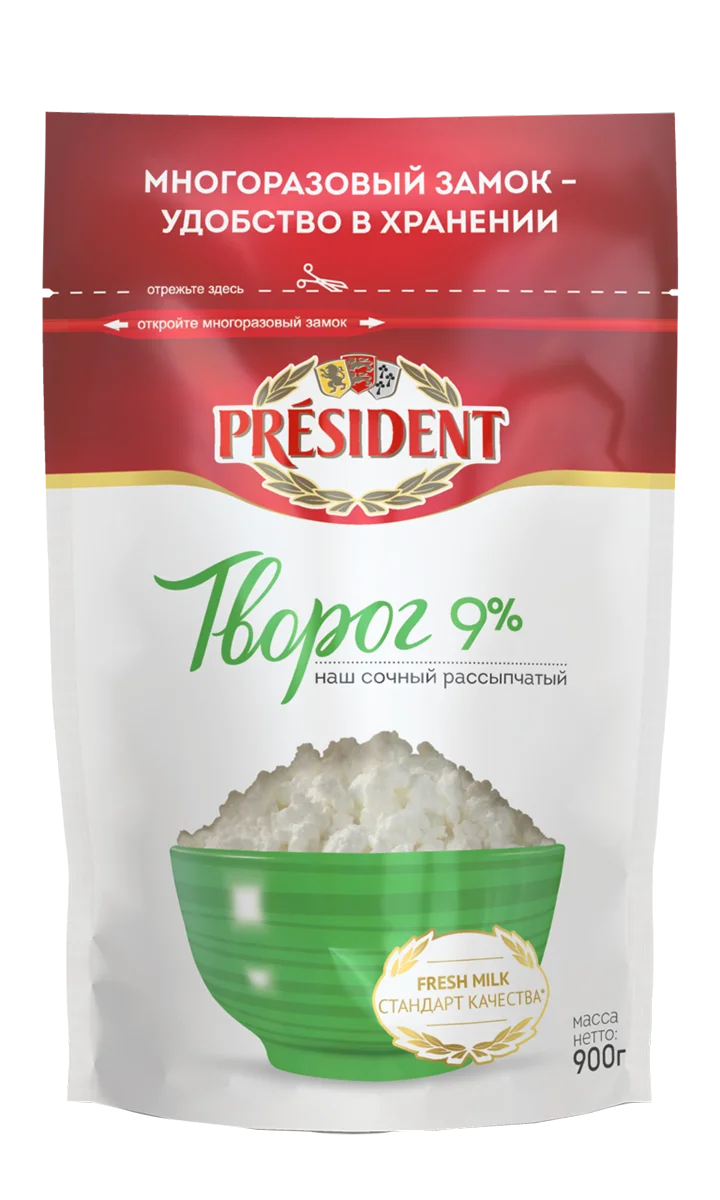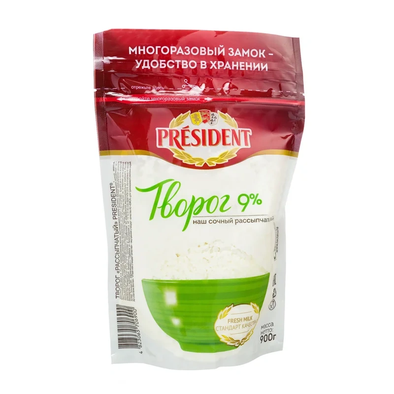 Творог PRESIDENT рассыпчатый, 9% 900 г – полезный и натуральный продукт, созданный на основе отборного молока с использованием кисломолочных бактерий. Творог исключительно полезен для человеческого организма, так как является ценным источником чистого белка, содержит много кальция и прочих микроэлементов. Кроме того, кисломолочные ферменты животного происхождения играют немаловажную роль в нормализации работы ЖКТ. Большая упаковка удобна для всей семьи, она подойдет для приготовления различных запеканок, сырников и прочих блюд. Производитель: ОАО Ефремовский маслосыродельный комбинат, Россия. Состав: молоко нормализованное, хлорид кальция, закваска, молокосвертывающий ферментный препарат животного происхождения. Пищевая ценность: белки – 14 г, жиры – 9 г, углеводы – 2 г. Энергетическая ценность: 145 ккал. Срок годности: 30 дней. Условия хранения: хранить при температуре от 2°С до 6°С. ГОСТ ТУУ 15.5-23624594.015-2002.