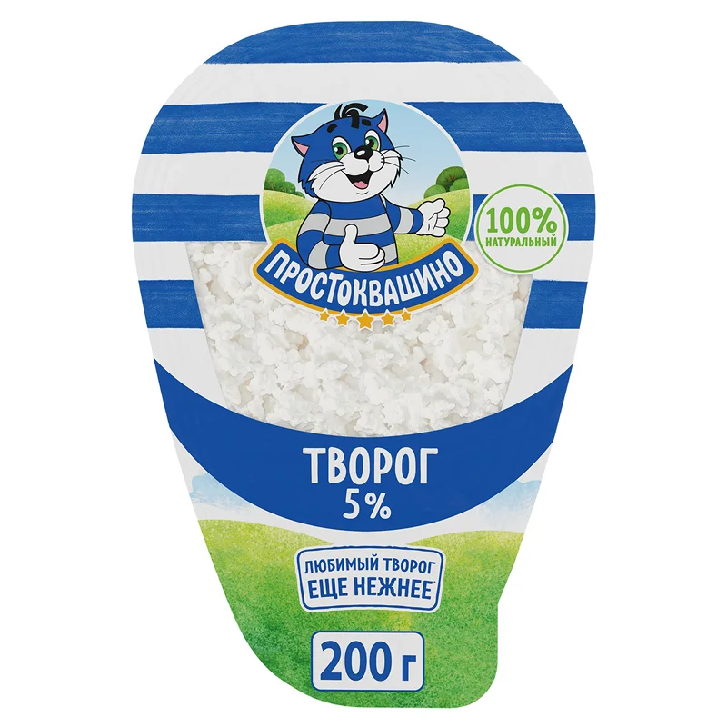 Творог Простоквашино 5 % 200г. Наш творог готовится только из 100% натуральных ингредиентов, без консервантов и растительных жиров, и отжимается особенным образом, по-Простоквашенски, чтобы творог был плотным, а блюда из него получались вкусными и сытными, на 5 звезд!