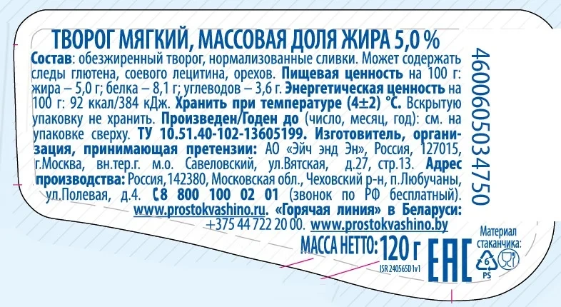 Мягкий творог Простоквашино 5% - это нежная кремовая текстура и сливочный вкус с умеренной кислинкой. Простой и 100% натуральный состав - только обезжиренный творог и сливки. А еще в нем много белка и кальция - все, что нужно для полезного ежедневного рациона. Отлично подходит на завтрак или для сытного, здорового перекуса. Натуральный продукт, обладающий нежной кремовой консистенцией. Диетический продукт, богатый кальцием. Он восполняет дефицит белка, незаменим в рационе беременных женщин, детей и людей пожилого возраста. Прекрасно подойдет как для завтрака, так и для быстрого перекуса. Содержит минимальное количество жиров.