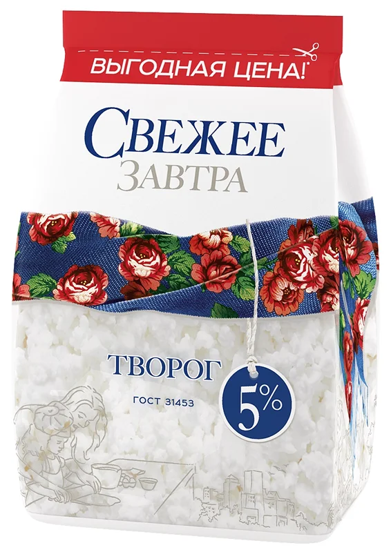 Творог Свежее завтра 5% приготовлен по ГОСТу из молока высшего сорта. Имеет крупное зерно и насыщенный сливочный вкус. Не содержит антибиотиков, консервантов и растительных жиров.