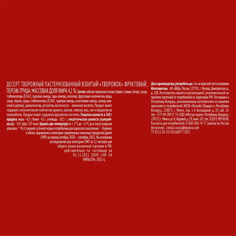 Состав: творог, сливки, сахар, молоко цельное, вода, стабилизаторы (дикрахмаладипат ацетилированный, дикрахмалфосфат оксипропилированный, желатин, пектин, гуаровая камедь, ксантановая камедь, камедь рожкового дерева, камедь тары), молоко сухое обезжиренное, краситель натуральный, ароматизатор идентичный натуральному, регулятор кислотности - лимонная кислота, с использованием закваски.