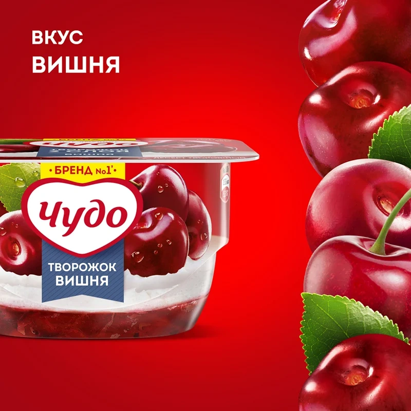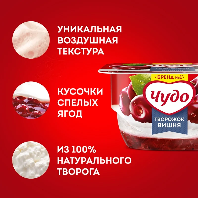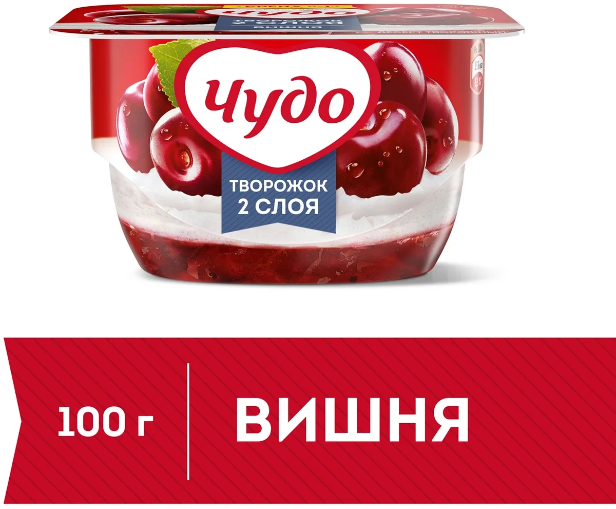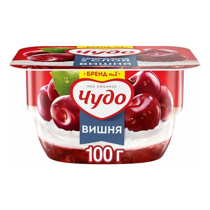 Десерт Чудо творожок воздушный Вишня. Воздушное творожное лакомство 'Чудо' с вишней - это ни с чем не сравнимое удовольствие! Сочетание великолепной, тающей текстуры творожка с нежным ягодным ароматом вишни дарит истинное наслаждение. Перекус таким десертом станет вашим любимым временем дня. Положительно влияя на пищеварение, такой творожок, к тому же, полезен для нашего организма. Объем: 100г, жирность 4,2%.