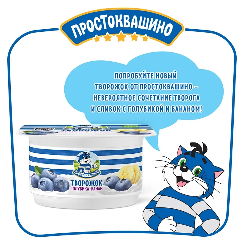 Попробуй лето в баночке - новый творожок от Простоквашино со вкусом спелой голубики и банана. Густой и мягкий, такой нежный и сливочный вкус творожка с сочными ягодами, и натуральный состав. Идеально подходит для завтрака или перекуса.