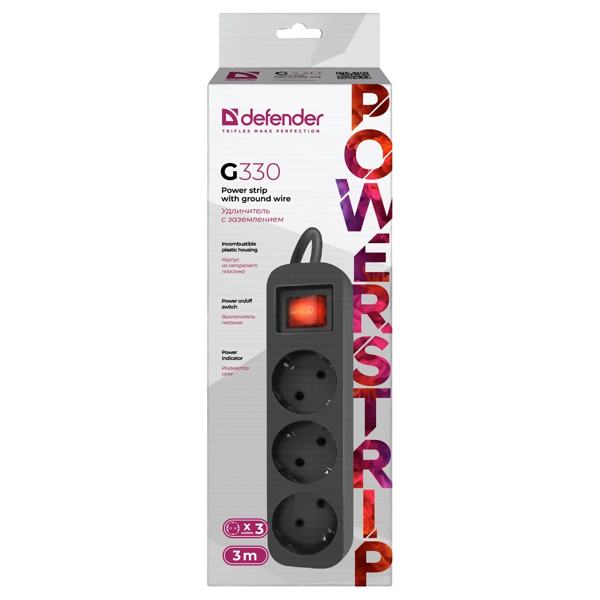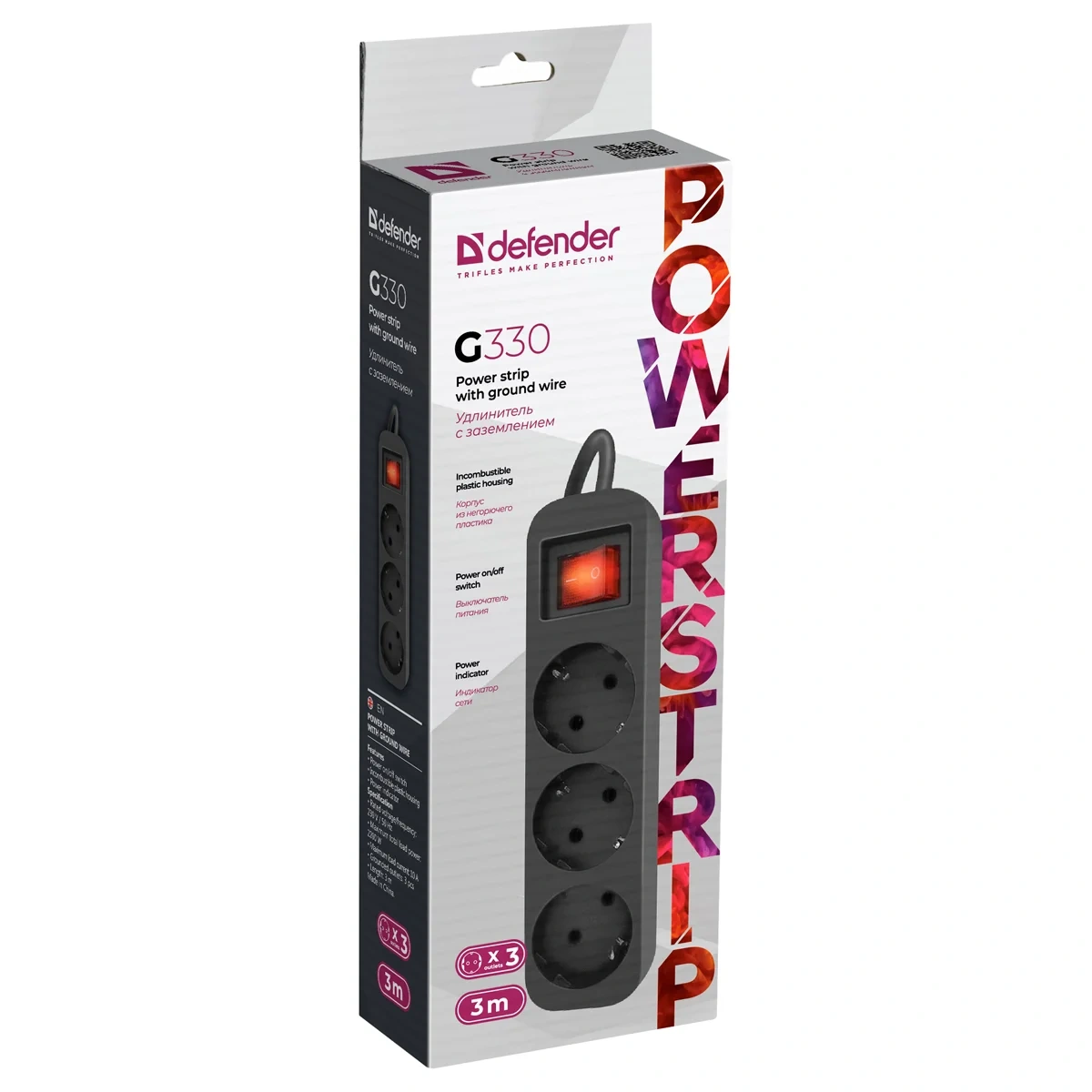 Удлинитель Defender G330, 3 розетки, с заземлением, выключатель, 3м, черный