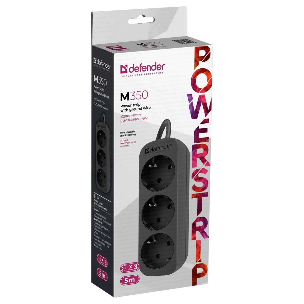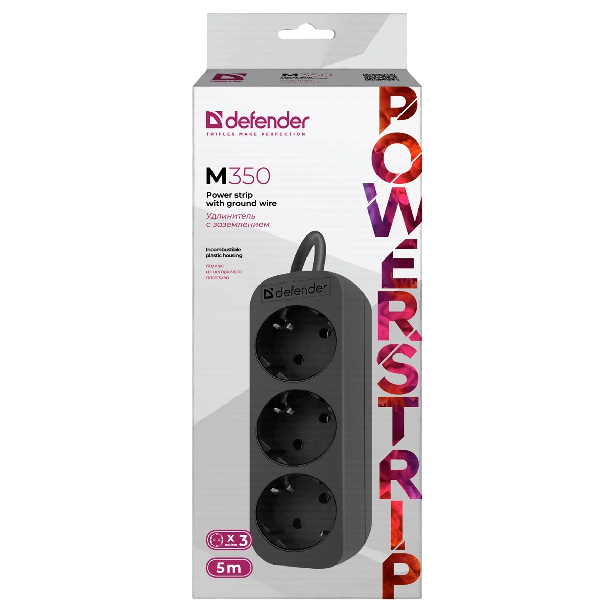 Удлинитель Defender M350, 3 розетки, с заземлением, 5м, черный
