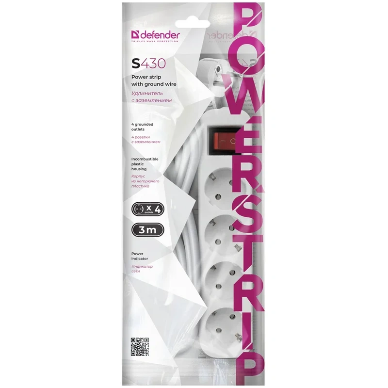 Удлинитель Defender S430, 4 розетки, с заземлением, выключатель, 3м, белый