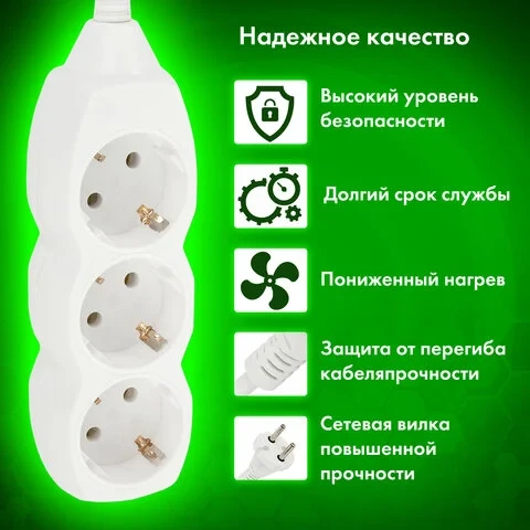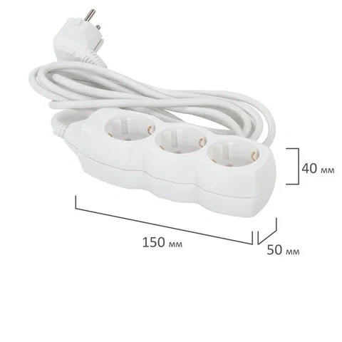 Сетевой удлинитель в пластиковом корпусе оснащен 3 евророзетками без заземления. Максимальный ток нагрузки – 6 А. В сочетании эти параметры позволяют безопасно подключать к удлинителю до 3 электроприборов. Длина кабеля – 3 метра, что позволит использовать удлинитель как внутри помещения, так и снаружи.