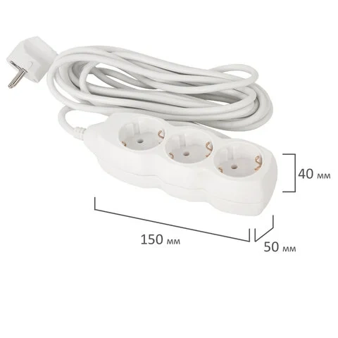 Сетевой удлинитель в белом пластиковом корпусе оснащен 3 евророзетками с заземлением. Максимальный ток нагрузки подключенных устройств может достигать 10 А. В сочетании эти параметры позволяют безопасно подключать к удлинителю до 3 электроприборов. Длина кабеля – 5 метров, что позволит использовать удлинитель как внутри помещения, так и снаружи.