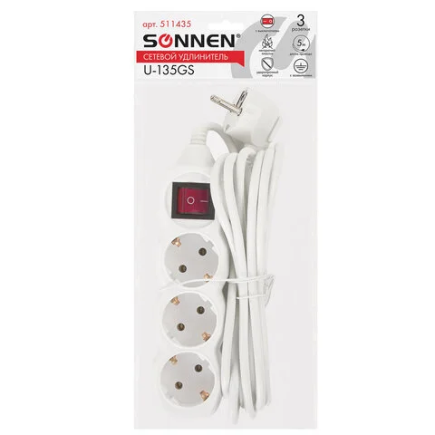 Удлинитель сетевой SONNEN U-135G, 3 розетки, c заземлением, 10 А, 5 м, 511433