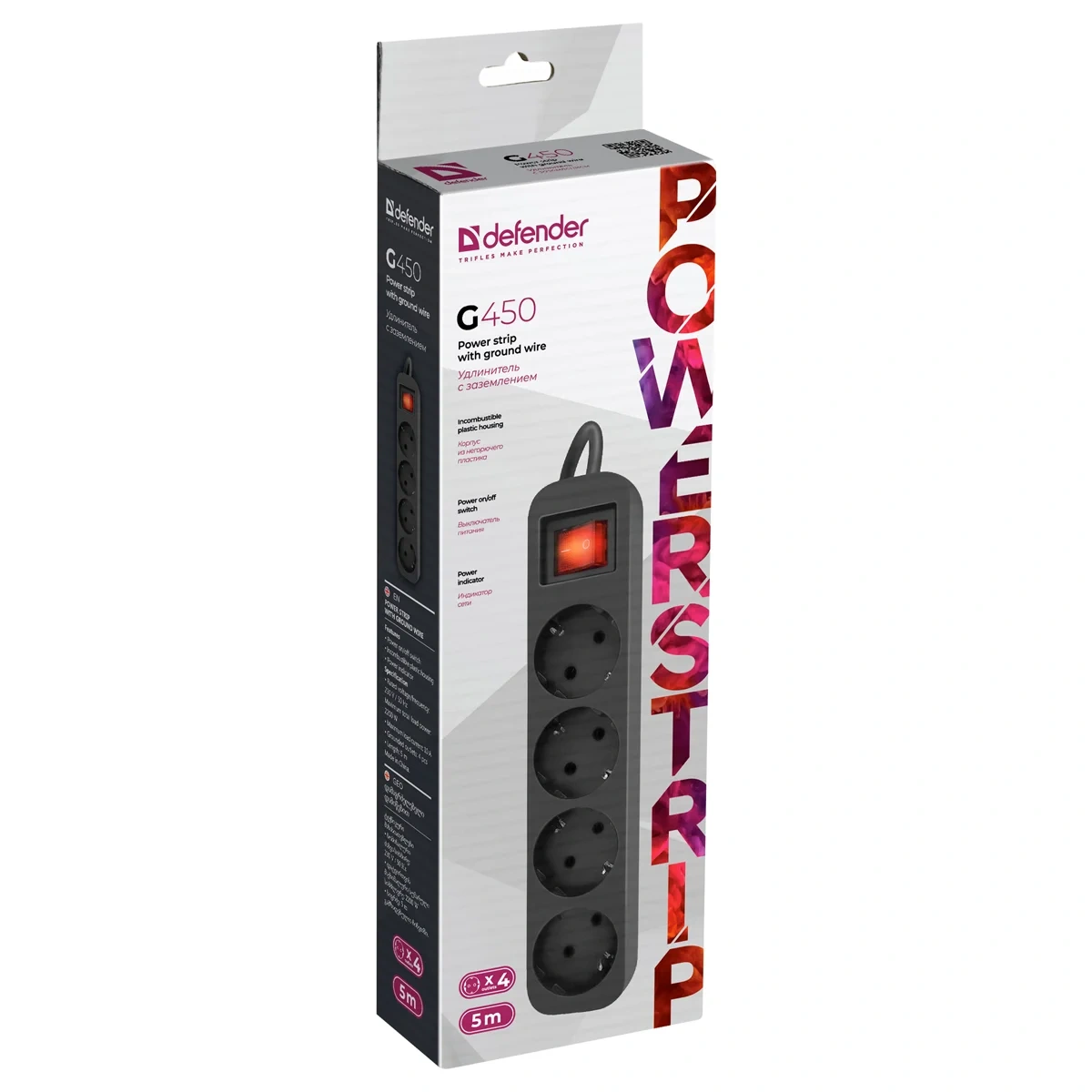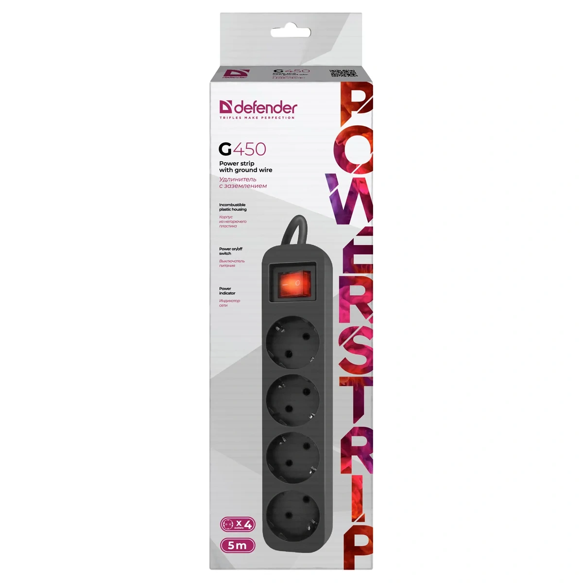 Удлинитель Defender G450, 4 розетки, с заземлением, выключатель, 5м, черный