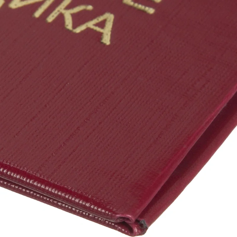Обложка твердая, выполнена из бумвинила. Цвет бордовый, на обложке имеется тиснение золотой фольгой.