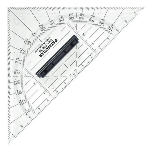 Геометрический треугольник Staedtler Mars 568. Длина - 22 см. Съемная ручка и четкая нестираемая разметка делает работу с инструментом особенно удобной.