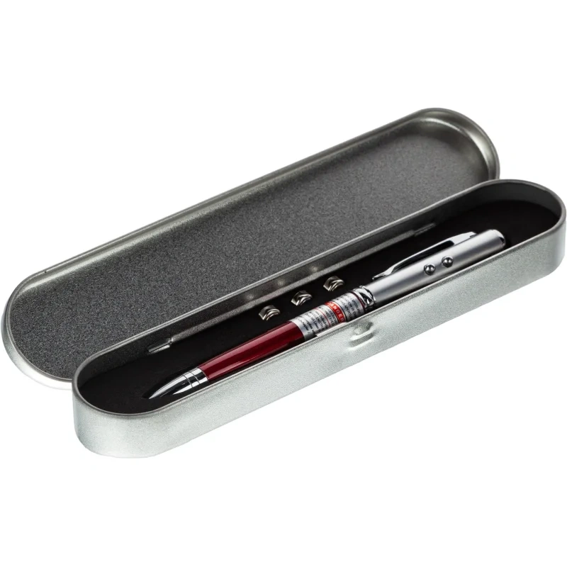 Лазерная металлическая указка оснащена светодиодом и красным лазерным лучом с радиусом действия до 200 метров. Отличается многофункциональностью — помимо использования для презентаций может применяться в качестве стилуса для мобильных устройств (предназначенных для данного функционала), детектора подлинности денежных купюр, а также имеет пишущий шариковый стержень. Для удобства хранения и использования корпус указки выполнен в виде ручки с карманным зажимом. Поставляется в подарочном футляре, с элементами питания типа LR 41 в комплекте (3 штуки), мощностью 5 ватт. Цвета указки — серебристый и бордовый. Стержень: диаметр 2.2 миллиметра, длина 55 миллиметров. Габариты указки: 13.5×1.6 сантиметра. Вес: 19.3 грамм.