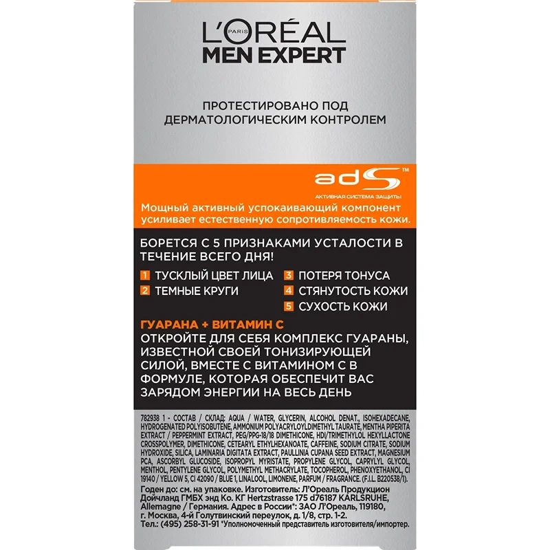 Комплекс Гуараны, известной своей тонизирующей силой, вместе с Витамином С обеспечит вас зарядом энергии на весь день. Ежедневно наносите крем на очищенную кожу лица утром и вечером энергичными массирующими движениями. При использовании после бритья устраняет ощущение жжения и покраснения. Борется с 5 признаками усталости в течение всего дня: 1. Тусклый цвет лица, 2. Темные круги, 3. Потеря тонуса, 4. Стянутость кожи, 5. Сухость кожи.