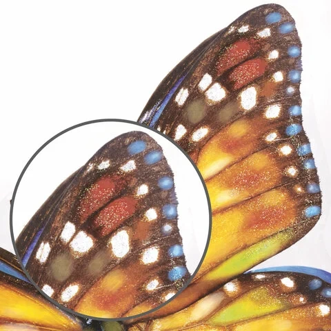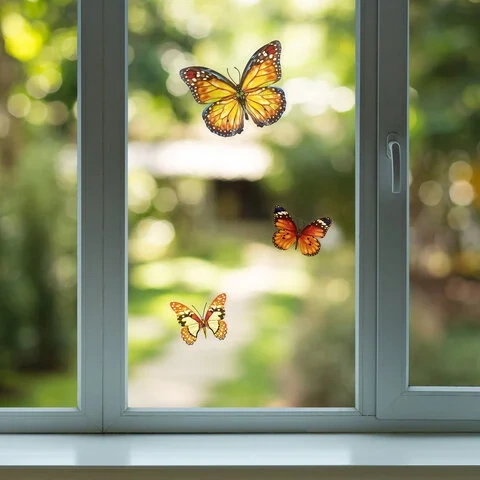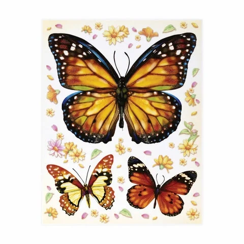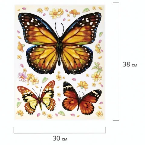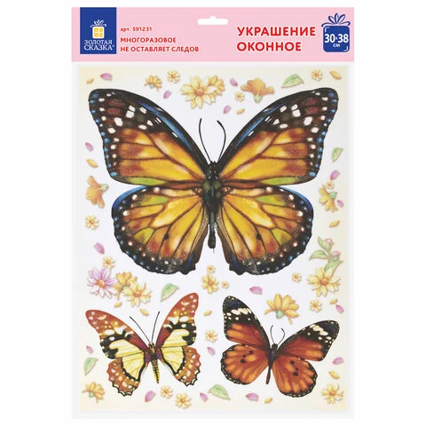 Изделие с изображением красочных бабочек представляет собой наклейку на окно/стекло, изготовленную из поливинилхлорида (ПВХ). Наклейка размером 30x38 см декорирована разноцветным глиттером. Украшение предназначено для декорирования окон, зеркал, стекол и других ламинированных глянцевых поверхностей. Не оставляет клеевых следов и предназначено для многократного использования. Крепится к поверхности посредством статического эффекта. Украшение на белой картонной подложке упаковано в прозрачный полипропиленовый пакет на картонном подвесе.