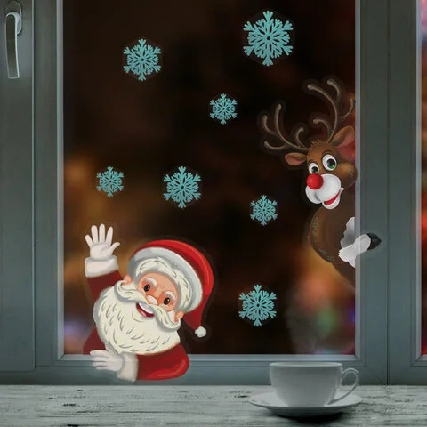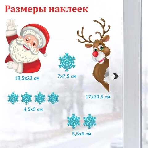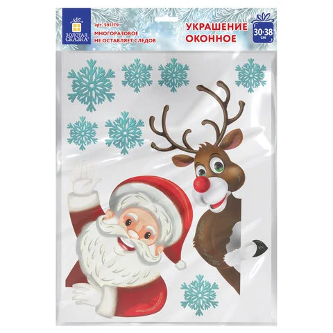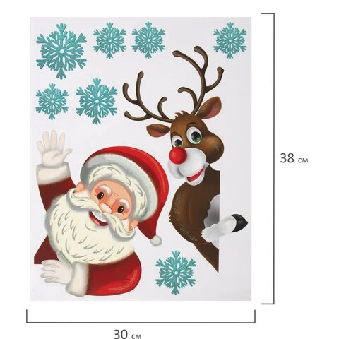 Изделие с изображением Деда Мороза, оленя и снежинок представляет собой наклейку, изготовленную из поливинилхлорида (ПВХ). Наклейка размером 30x38 см декорирована серебристым глиттером. Украшение предназначено для декорирования окон, зеркал, стекол и других ламинированных глянцевых поверхностей. Не оставляет клеевых следов и предназначено для многократного использования. Крепится к поверхности посредством статического эффекта.