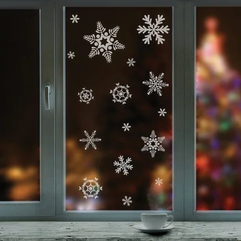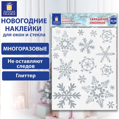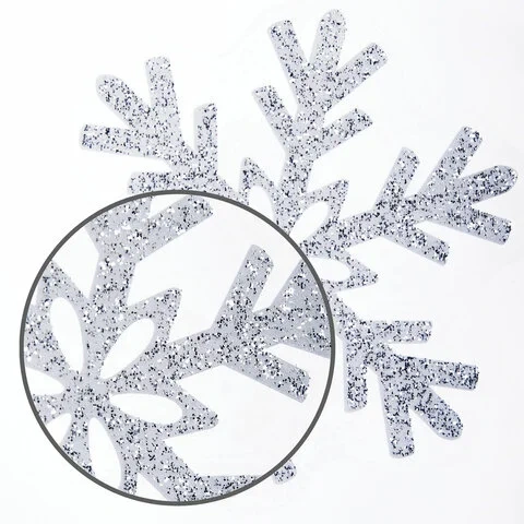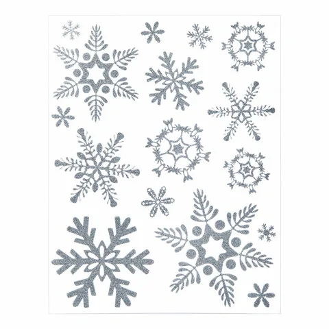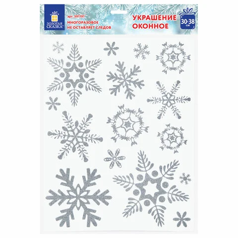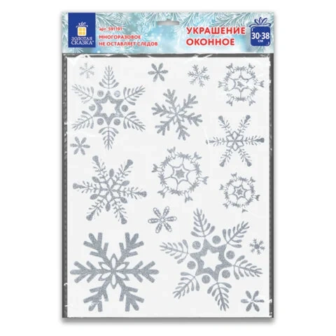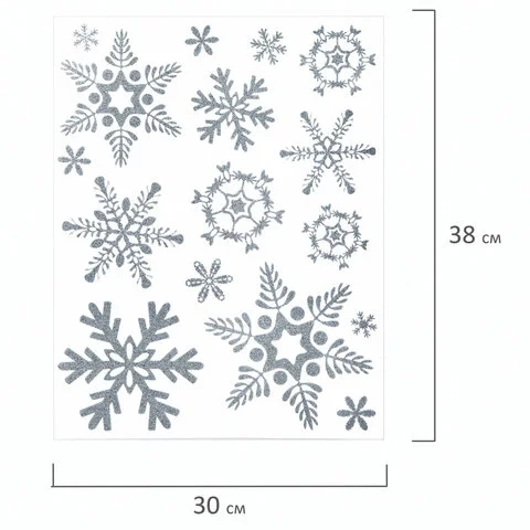 Изделие с изображением серебристых снежинок представляет собой наклейку, изготовленную из поливинилхлорида (ПВХ). Наклейка размером 30x38 см декорирована серебристым глиттером. Украшение предназначено для декорирования окон, зеркал, стекол и других ламинированных глянцевых поверхностей. Не оставляет клеевых следов и предназначено для многократного использования. Крепится к поверхности посредством статического эффекта.